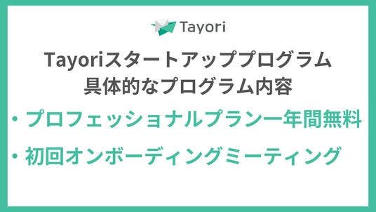Tayoriスタートアッププログラムは、Tayoriのプロフェッショナルプランを1年間無料で利用でき、立ち上がりのサポートもおこなう(初回オンボーディングMTGを無料提供)ものとなります。同プログラムは、パートナーVCの投資先を対象としており、第1弾パートナーにはB Dash Ventures様にご参加いただきました。