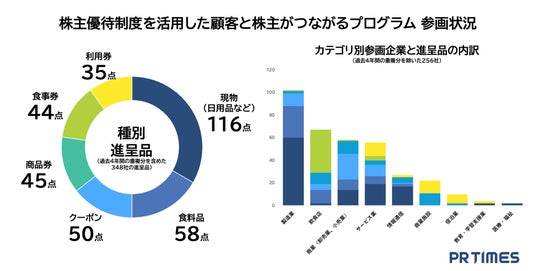 本プログラムは、「PR TIMES」ご利用企業との新しい出会いを生み出すことを目的に実施し、その点を株主からも評価いただいています。上のグラフでは、これまでの256社の参加企業の業種と種別(現物やチケットなど)を表しています。参画をご検討いただくご利用企業の皆様にとって、未来のお客様になるかもしれない方への進呈品を考える参考にしていただければ幸いです。