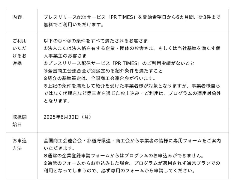 商工会の会員であり、かつ下記の条件を満たす各事業者に対し、それぞれ開始を希望する日から6カ月間、計3件まで無料で「PR TIMES」でプレスリリース配信いただける「全国商工会連合会プログラム」を提供します。【全国商工会連合会プログラムについて】