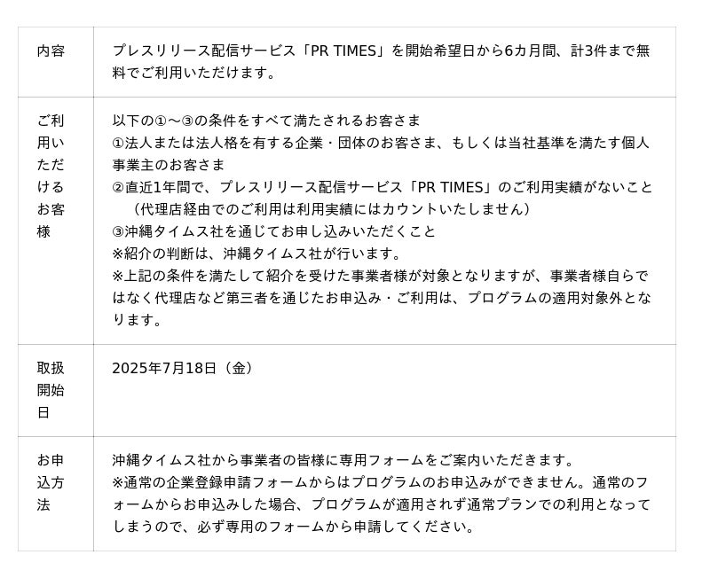 沖縄タイムス社が紹介する事業者に対し、各事業者がそれぞれ開始を希望する日から6カ月間、計3件まで無料で「PR TIMES」でプレスリリース配信いただける「沖縄タイムスプログラム」を提供します。