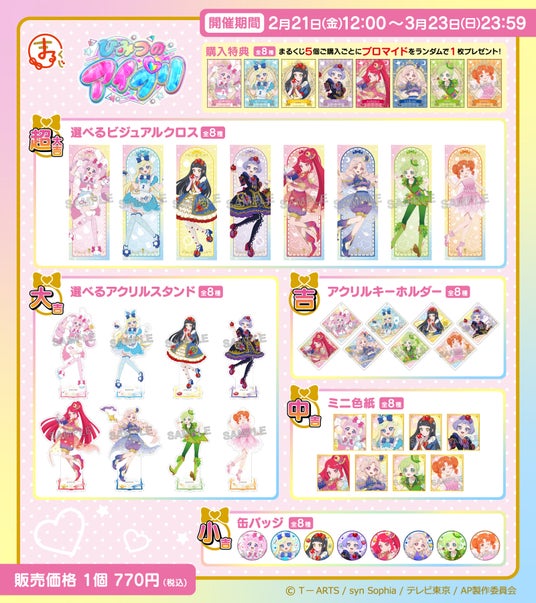 各賞の商品といたしましては、ビジュアルクロス、アクリルスタンド、アクリルキーホルダー、ミニ色紙、缶バッジなど、ファンの皆様に喜んでいただけるラインアップとなっております。