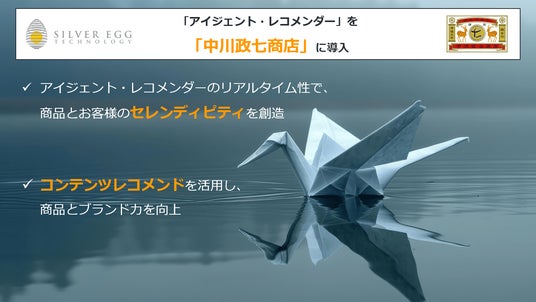 シルバーエッグ・テクノロジー株式会社(本社:大阪府吹田市、代表取締役社長&CEO:トーマス・フォーリー、証券コード 3961、以下 シルバーエッグ)は、同社が開発・提供するAI技術を用いたリアルタイム・レコメンドサービス「アイジェント・レコメンダー」を株式会社中川政七商店(本社:奈良県奈良市、以下 中川政七商店)が運営するオンラインショップ「中川政七商店」(https://nakagawa-masashichi.jp)に導入しました。これにより、少量・多品種商品の効果的な販促や、コンテンツマーケティングの活性化などが実現できたとの評価を得ました。