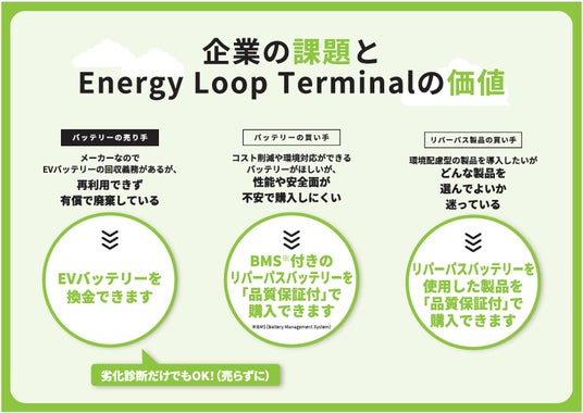 このたび、この技術を応用して「診断・評価基準」をモジュールごとに付与することをはじめ、これまで他社ではできなかった安全制御システムBMS※2付EVバッテリーおよびリパーパス製品自体に「品質保証」を付帯する付加価値を提供するなど、使用済みEVバッテリーのリパーパス製品を安心安全に流通できるプラットフォーム「Energy Loop Terminal」の予約受注を開始いたします。