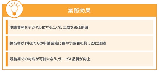 申請業務をデジタル化することで工数を95%削減したほか、短納期での対応が可能となり、サービス品質向上も実現