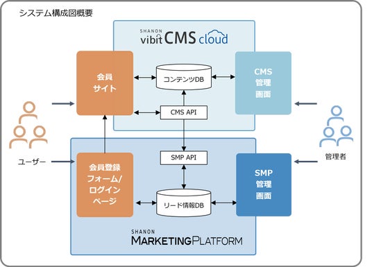 「じぶんでDX 会員サイト作成パッケージ」は、SHANON vibit CMS cloud(以下CMS)と統合型マーケティング支援システムSHANON MARKETING PLATFORM(以下SMP)を活用し、ユーザー自身で会員サイトを作成できるサービスです。