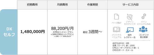 初期費用を抑えた「DXセルフ」プランだけでなく、ページ設計やメインビジュアル、オリジナルマニュアルの作成サービスを追加した上位プラン(DXエコノミープラン、DXビジネスプラン)もご用意しております。