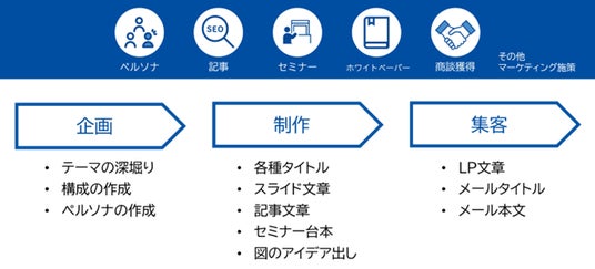 コンアシは、セミナーやホワイトペーパー、SEO記事やコラムなど多種多様なマーケティング施策を対象として、コンテンツの企画、制作、集客を一気通貫して生成AIでサポートします。