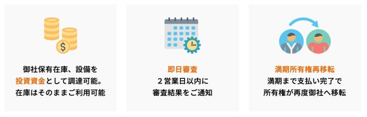 自社が保有する在庫や設備を資金調達の対象として活用することが可能です。在庫はそのままご利用いただけるため、業務への影響を最小限に抑えたまま、資金調達が可能です。即日審査対応、最短で3営業日以内に審査結果のご案内が可能です。契約満期時には、対象設備・在庫の所有権を利用企業へ再移転します。