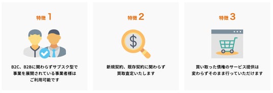 自社が保有する売掛債権を未来分まで一括で売却する資金調達手段です。最大1年間の買い取り期間および対象債権を決定し、一括での資金調達が可能です。BtoC・BtoBを問わず、サブスクリプション型ビジネスを展開している事業者が利用可能です。新規契約・既存契約を問わず買い取り査定が可能で、債権売却後も、サービス提供形式はそのままこれまで通り継続することが可能です。
