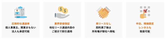 商材や設備の導入にあたり、「サブスククレジット」をご利用いただくことで、最大5年間の月額分割払いでの利用が可能です。本サービスは、高い審査通過率を誇り、個人事業主や開業間もない法人のお客様にもご利用いただけます。また、業界最安値を目指し、他社リースの審査通過内容をご提示いただければ、割引の適用も可能です。さらに、再リース不要で契約満了後、所有権は利用企業に移転します。中古製品のご利用や残価設定による柔軟なプラン設計にも対応しており、途中返却可能なレンタルサブスク形式での利用も可能です。