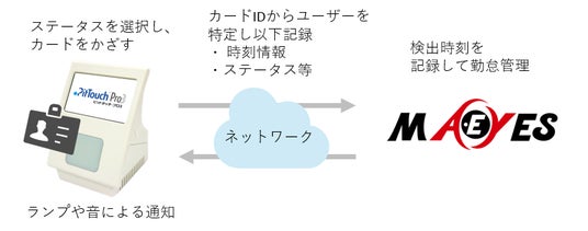出勤や退勤等のステータスを選んで、ピットタッチ・プロ3 勤怠パッケージにカードをかざすと、カードIDなどの情報よりユーザーを特定し、出退勤の打刻や外出などの情報を記録できます。その情報はMA-EYESの勤怠管理機能と自動で連携されます。