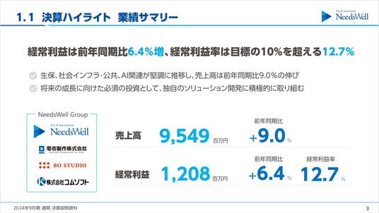 - 生保、社会インフラ・公共、AI関連が堅調に推移し、売上高は前年同期比9.0%の伸び