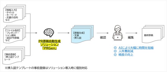 「PRGen」は、PR原稿の文章や挿入図を自動的に生成し、大幅な時間短縮、コスト削減、精度向上を実現するソリューションです。生成された原文に必要な編集や修正を加えるだけでPR原稿が完成するため、製品発表、イベント告知、ニュースリリースなど、さまざまな用途で企業のPR活動を支援します。