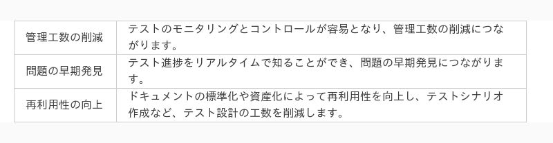 統一性のないドキュメントは、テスト設計、テスト実装に影響を及ぼし、生産性、品質、再利用性の低下を招きます。また、大量に発生するテストシナリオの集計や分析するための管理工数も、報告頻度に応じて膨大になります。