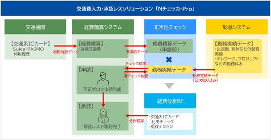 「Nチェッカ-Pro」は、経費精算システム・勤怠システムと連携し、Suica・PASMO利用履歴、経費申