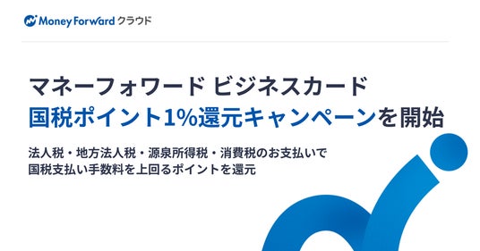 株式会社マネ―フォワードは、『マネーフォワード ビジネスカード』において、「マネーフォワード ビジネスカード 国税ポイント1%還元キャンペーン」を実施します。本キャンペーンは、2024年9月17日(火)からエントリーを開始し、『マネーフォワード ビジネスカード』で2024年10月1日(火)~10月31日(木)の間に、法人税・地方法人税・源泉所得税・消費税及び地方消費税を合計10万円以上支払ったユーザーに、ポイント還元を行います。