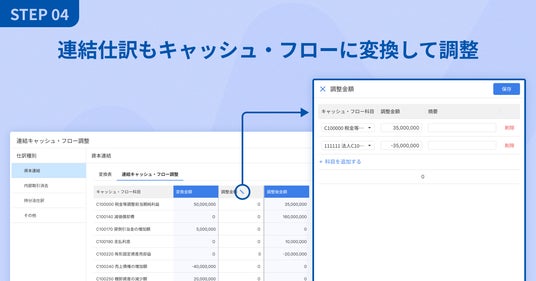 本機能では、システムが生成する簡易的な個別キャッシュ・フローの(以下「個別CF」)の調整をするだけで、精度の高い連結CFを作成できます。また、本機能は間接法・直接法の双方に対応しています。 なお本機能について、当社は特許の出願手続きを済ませております。