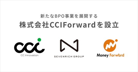 株式会社CCイノベーション(代表取締役社長:菊澤 智彦)と、セブンリッチグループのBPO(ビジネス・プロセス・アウトソーシング)事業会社である株式会社BPIO(代表取締役社長:一杉 勇輝)、株式会社マネーフォワード(代表取締役社長:辻 庸介)は、株式会社CCIForward(シーシーアイフォワード)を設立することをお知らせいたします。