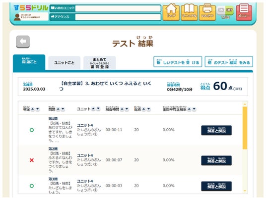 さらに、プレテストの結果は「すららドリル」の体系学習の仕組みと連携し、過去の学習内容にさかのぼって学ぶことができるため、つまずきを解消しながら着実に理解を深めることができます。学習内容をしっかり定着させてからワークテストに臨むことで結果につながり、それによって、児童の学習意欲の向上につながることが期待できます。