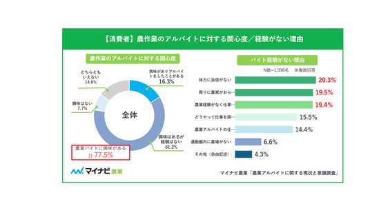 消費者は農作業や農業アルバイトにどの程度興味をもっているか、また、農家は人手不足にどのように対応しているか――。マイナビが運営する農業の総合情報サイト「マイナビ農業」で実施された「農業アルバイトに関する現状と意識調査※」によると、消費者の大多数が農業バイトに興味がある一方で、実際に農作業のアルバイトをしたことがある人は少数である、という現状が明らかになりました。