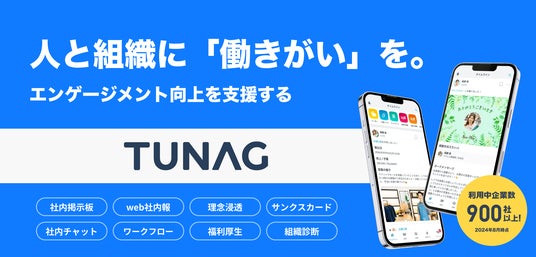 TUNAG(ツナグ)は、組織の生産性向上や離職率の低減を目的に、社内コミュニケーションと情報共有を促進し、従業員エンゲージメントを向上させるために開発されたプラットフォームサービスです。現在利用企業数は900社・利用ユーザー数は100万人を突破しています。