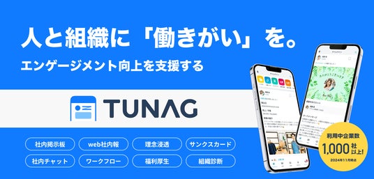 TUNAG(ツナグ)は、組織の生産性向上や離職率の低減を目的に、社内コミュニケーションと情報共有を促進し、従業員エンゲージメントを向上させるために開発されたプラットフォームサービスです。現在利用企業数は1,000社・利用ユーザー数は100万人を突破しています。