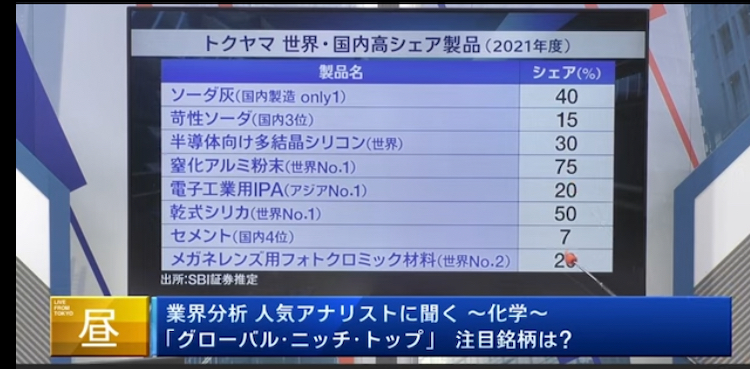 乾式シリカ 世界一位 世界シェア50%。 窒化アルミ粉末 世界一位 世界シェア70% 半導体用多結晶シリコン 世界シェア30% メガネレンズ用フォトクロミック世界2位 その他 歯充填材。光を当てると周りの歯と同じ色になる。オンリーワンの商品。これだけで80億利益。