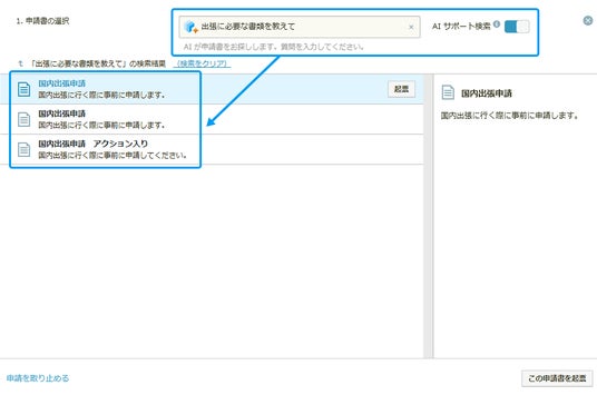 従来のキーワード検索と比べて柔軟な申請書ひな型の検索が可能になります。例えば、「出張に必要な手続きは?」や「パソコンを買いたい」といった質問文で、目的に合った申請書を検索結果として提示します。