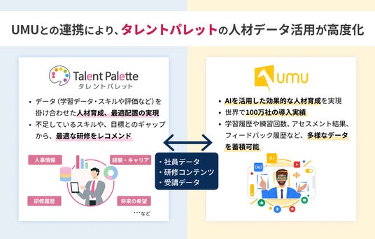 本協業により、タレントパレットにUMUが提供する人材育成・研修コンテンツが連携されるほか、受講データに従業員のスキル・キャリア志向等を掛け合わせた最適なレコメンド機能を搭載し、従業員一人ひとりが意欲的に知識やスキルの習得に取り組む自律的な学習文化の醸成を支援します。