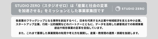 STUDIO ZERO株式会社プレイドの社内起業組織「STUDIO ZERO(スタジオゼロ)」は、日本を代表する大企業や地域経済を支える中小企業、新進気鋭のスタートアップ・ベンチャー、そして行政・公的機関と並走し価値創出を行うことで、新たな事業を開発する組織です。