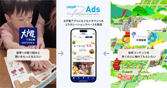 具体的な施策として、大戸屋アプリに「Yappli Premium Ads」を通じて大塚製薬が本年2月より公開している食育ゲームアプリ「もぐもぐタウン」をコンテンツのひとつとして掲載。身近なアプリを活用し、来店時だけでなく、自宅や隙間時間でも楽しく継続的に親子でコミュニケーションをとりながら食や栄養について学ぶことができます。