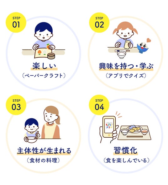 大戸屋に来店したお子様連れのお客様に、食の楽しさから興味、習慣化まで4つのステップにより食育を身近に感じてもらい、「食を楽しむこと」を伝えていきます。