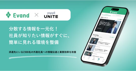 従業員エンゲージメントの課題解決サービス「Yappli UNITE(ヤプリユナイト)」を提供する株式会社ヤプリ(本社:東京都港区、代表取締役:庵原保文、以下「ヤプリ」)は、人材事業を手がけるEvand株式会社(本社:大阪府大阪市北区、代表取締役:石田優太郎、以下「Evand」)が運営する、外勤・内勤社員向けアプリ「Evanavi(エヴァナビ)」を開発支援したことをお知らせします。