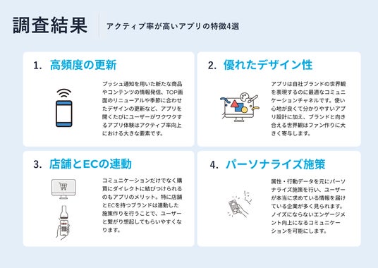 また、アクティブ率上位のアプリから推察された使われるアプリの特徴は「高頻度の更新」「優れたデザイン性」「店舗とECの連動」「パーソナライズ施策」の4つです。