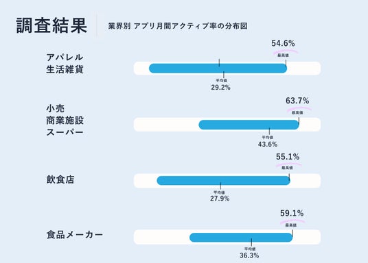 アクティブ率の平均値は、業界ごとの購買頻度が大きく影響していると考えられます。そのため、本調査の結果を活用する際は、自社の購買頻度や顧客とのコミュニケーション手法を考慮し、適切なアプリKPIの設定と効果測定を行うことが重要です。