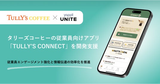 アプリプラットフォーム「Yappli(ヤプリ)」を提供する株式会社ヤプリ(本社:東京都港区、代表取締役:庵原保文、以下「ヤプリ」)は、タリーズコーヒージャパン株式会社(本社:東京都新宿区、代表取締役社長:小林 義雄、以下「タリーズ」)が新たに導入した従業員向けアプリ「TULLY’S CONNECT」の開発支援したことをお知らせいたします。