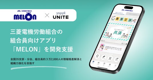 株式会社ヤプリ(本社:東京都港区、代表取締役社長:庵原 保文、以下「ヤプリ」)は、三菱電機労働組合(本部:神奈川県横浜市、中央執行委員長:浅田 和宏、以下「三菱電機労組」)が、従業員エンゲージメント向上サービス「Yappli UNITE(ヤプリユナイト)」を活用し、組合員向けアプリ「MELON」の開発を支援したことをお知らせいたします。