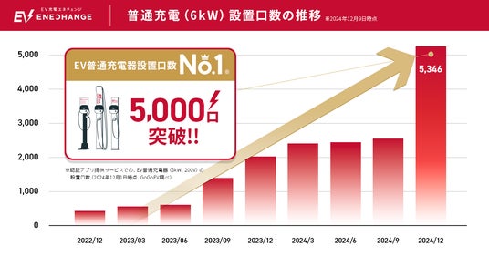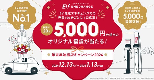 ENECHANGE(エネチェンジ)株式会社(本社:東京都中央区、代表取締役CEO:丸岡 智也)は、「EV充電エネチェンジ」の目的地充電設置口数が5,000口を突破いたしましたことをお知らせします。また、5,000口突破を記念し、2024年12月13日(金)から2025年1月13日(月)までの期間、EV普通充電設置口数No.1 ※1 の「EV充電エネチェンジ」5,000口突破記念 年末年始福袋キャンペーン2024を実施いたします。「EV充電エネチェンジ」アプリから100分以上充電いただいた方、およびe-Mobility Powerや自動車メーカー各社が提供する充電カード(以下:充電カード)、TOYOTA Walletアプリから200分以上充電いただいた方の中から抽選でオリジナル福袋をプレゼントいたします。