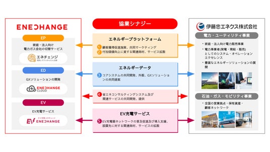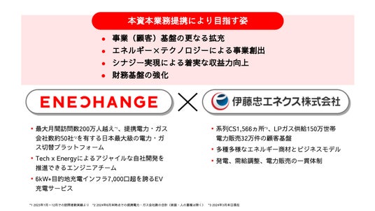 今回の資本業務提携を通じ、ENECHANGEが有する「エネルギープラットフォーム事業」、「エネルギーデータ事業」、「EV充電事業」におけるノウハウ、経営資源と、伊藤忠エネクスグループが持つエネルギー・インフラ事業者としての知見、取引先ネットワーク、事業開発力を掛け合わせ、下記、「本資本業務提携の概要」記載の各シナジー追求を図ることにより、両者の成長性・将来性は、より一層大きくなるものと考えております。