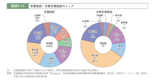 首都圏白書は、首都圏整備法(昭和31年法律 第83号)第30条の2の規定に基づき、首都圏整備計画の策定及び実施に関する状況について、国土交通省が毎年国会に報告しているものです。2025年5月27日、令和7年版の首都圏白書が閣議決定され、公開されました。その中で、第5節 環境との共生(交通分野における取組)において、ENECHANGEが運営する「EVsmart.net」の充電施設数のデータを昨年に続き今年も提供し、参照されました。