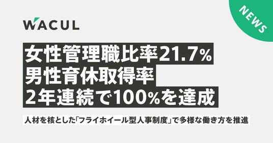 データと知見を核に、戦略から実行までマーケティングDXを一気通貫で支援する株式会社WACUL(本社:東京都千代田区、代表取締役社長:大淵 亮平、証券コード:4173、読み:ワカル、以下当社)は、多様で柔軟な働き方の推進を通じて、女性管理職比率が21.7%へ上昇、男性育休取得率が2年連続で100%を達成したことをお知らせします。