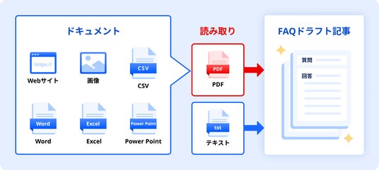 社内マニュアル、規定集、製品情報といった、企業内に蓄積された様々なドキュメントデータを「コンパス・キューエー」に連携させることで、生成AIがそれらの情報を解析し、FAQに掲載すべき「質問文」とそれに対する「回答文」のドラフト案を自動で提案いたします。