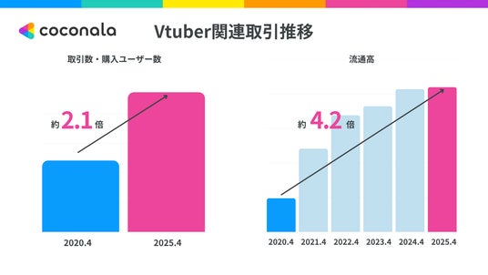 ココナラにおける取引推移を調査した結果、2025年4月時点でのVtuber関連サービスの取引数及び購入ユーザー数は、2020年4月と比較して約2.1倍に増加していることが明らかになりました。