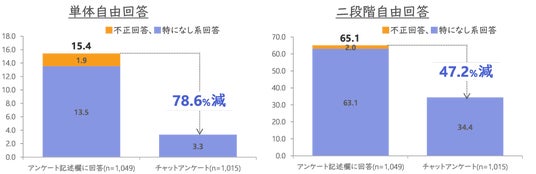 チャットアンケートによる自由回答は、アンケート記述欄に回答する場合と比較して「特になし・不正回答」の発生率を大幅に削減し、回答の質を向上させることができることを確認しました。