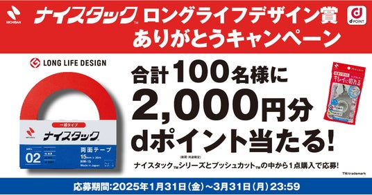 ニチバン株式会社(本社:東京都文京区、社長:高津敏明)は、両面テープ「ナイスタック(TM)」が2024年度グッドデザイン・ロングライフデザイン賞を受賞したことを記念して、「ナイスタック(TM)」シリーズの購入レシートを撮影して応募すると、抽選で100名様にdポイント2,000ポイントが当たる「ナイスタック(TM)ロングライフデザイン賞ありがとうキャンペーン」を2025年1月31日(金)より開始いたします。