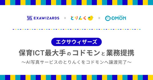 株式会社エクサウィザーズ(東京都港区、代表取締役:春田 真、以下エクサウィザーズ)は、子会社である株式会社とりんく(旧社名:VisionWiz、本社:東京都港区、代表取締役:山中健太郎、以下とりんく)の全株式の株式会社コドモン(本社:東京都港区、代表取締役:小池義則、以下コドモン)への譲渡が完了し、同時に、業務提携に向けた基本合意書を締結したことをお知らせします。