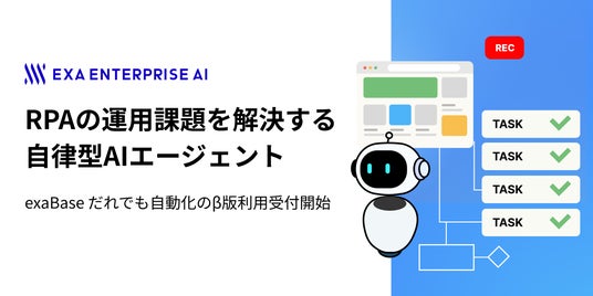 株式会社エクサウィザーズのグループ会社である株式会社Exa Enterprise AI(東京都港区、代表取締役:大植 択真、以下Exa Enterprise AI)は、RPAの構築・運用が容易に可能な「exaBase だれでも自動化」のβ版の利用受付を開始いたします。自律型AIエージェント*1を活用することで、現在RPAを構築・運用している人はもちろんのこと、IT技術に不慣れな人でも簡単にRPAを構築でき、自然言語でのメンテナンスが可能となります。本サービスにより、セキュリティを保ちつつRPAの運用で発生していた業務負荷を軽減し、現場から出てくる様々な自動化アイデアのさらなる実現や、より付加価値の高い業務に注力できることを目指してまいります。