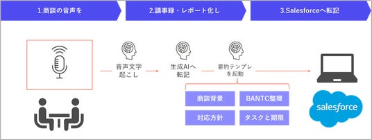 営業担当者の架電後の文字起こし、議事録作成(exaBase 生成AIを使用)、顧客管理ツール(Salesforceを使用)への転記を自動化し、商談1件あたり約15分の作業時間を2分にすることで、ピーク時の業務を140時間/月の業務時間を削減することに成功しました。これまでの入力ミスや情報の漏れ、複数のツールや画面を行き来するオペレーションの煩雑さといった課題解決に繋がりました。