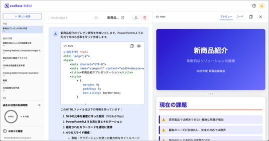 図2 :exaBase 生成AIのClaude Opus 4で、コードプレビュー機能を使用しプレゼン資料を作成した際のイメージ