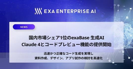 株式会社エクサウィザーズ(東京都港区、代表取締役社長 CEO︓春田 真、以下エクサウィザーズ)のグループ会社である株式会社Exa Enterprise AI(東京都港区、代表取締役:大植 択真、以下Exa Enterprise AI)は、国内市場シェア1位を獲得した*1法人向け生成AIサービス「exaBase 生成AI」において、米Anthropicの最新モデル「Claude Opus 4」「Claude Sonnet 4」の提供を開始しました。従来モデルと比べ大幅に性能が向上した高度なコーディング能力と複雑なタスク処理により、迅速かつ正確なコード生成を実現します。また、コードプレビュー機能の提供も開始し、ウェブデザインや資料作成、アプリ開発においてリアルタイムで簡単にプレビューが可能となります。
